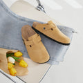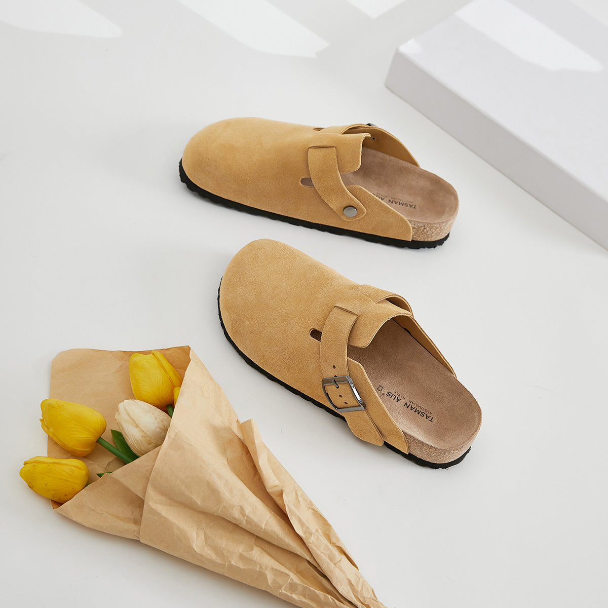 With their clean, rounded silhouette and soft leather upper, these slippers combine a classic feel with modern comfort. The partially exposed heel makes them easy to slip on and off, while the cork-infused rubber sole with EVA insert provides lightweight support and flexibility. Perfect for cozy days indoors or laid-back errands outside.