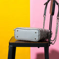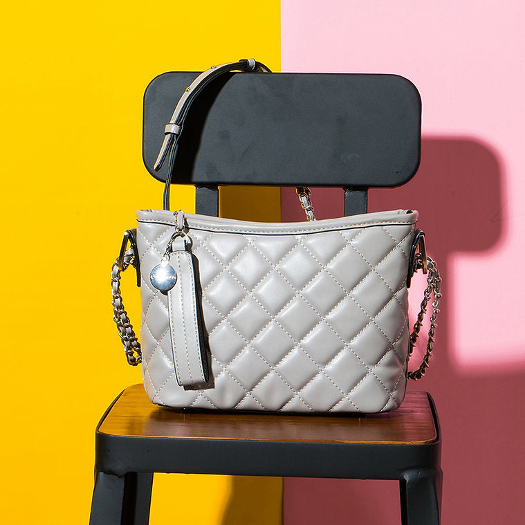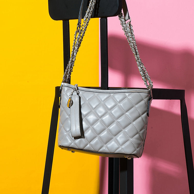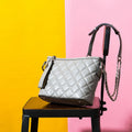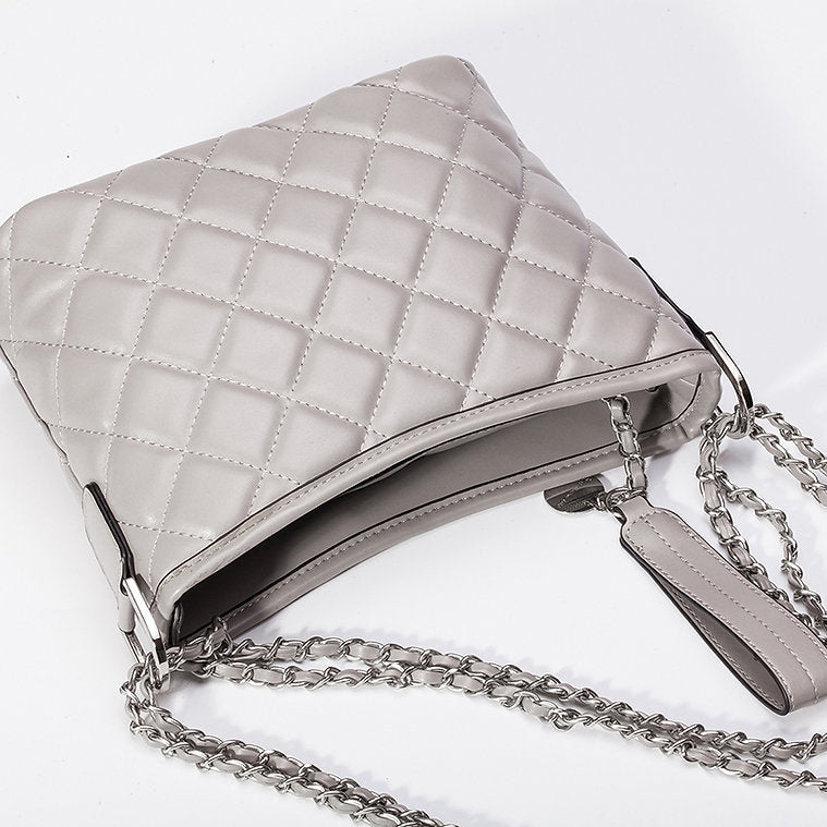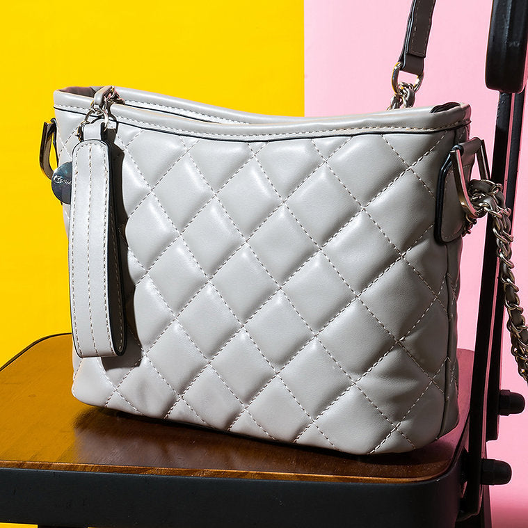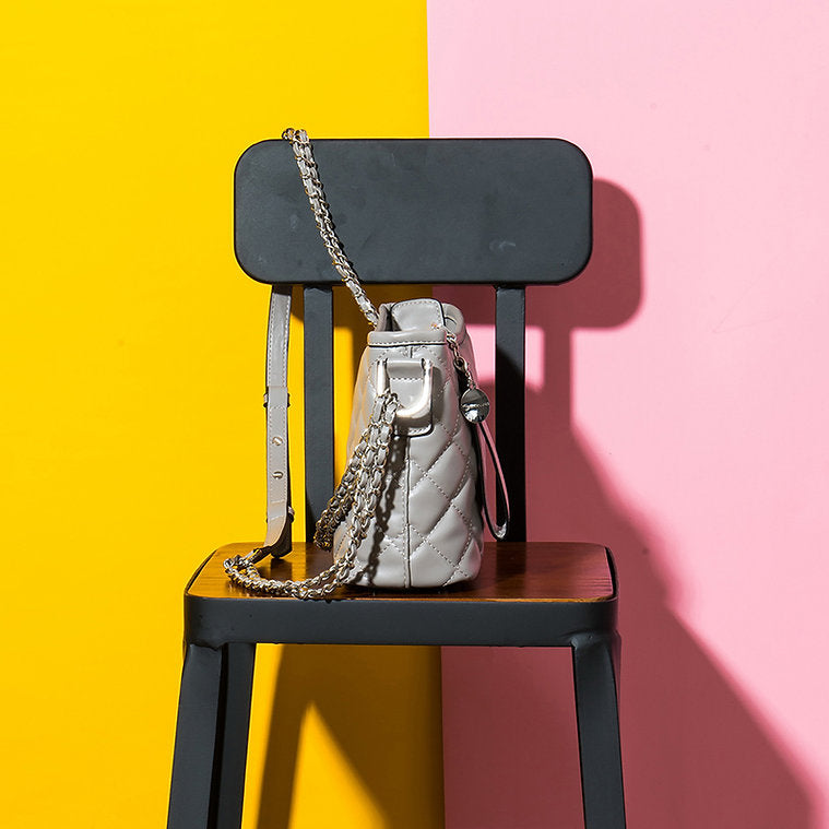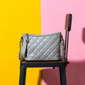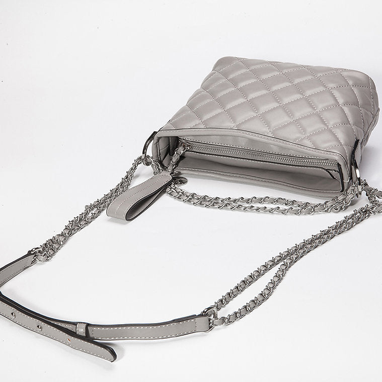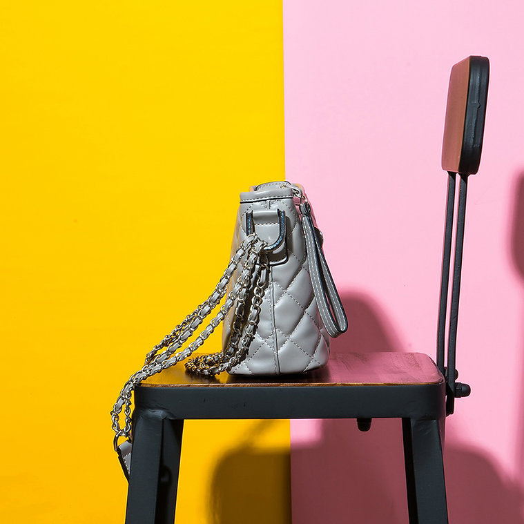 Chic and modern, the HOBO BAG in blue combines sustainability with standout design. Crafted with eco-friendly materials and lined with thick satin fabric, it features a quilted diamond pattern and bold metal chain detailing for a stylish finish. A zippered interior pocket adds extra function to its sleek shape — ideal for daily wear or evening outings.