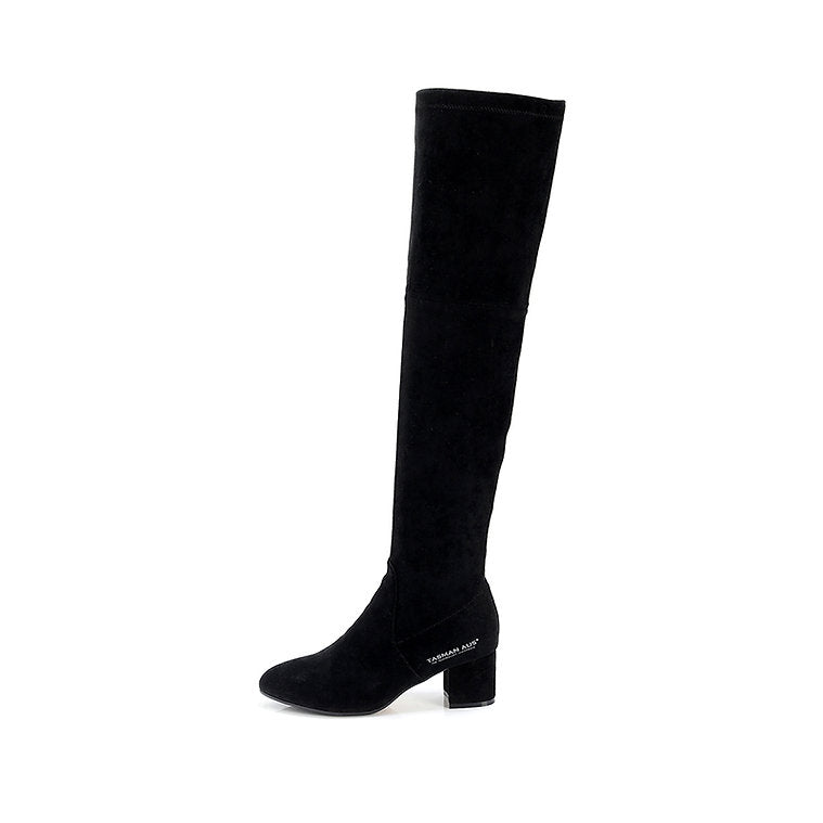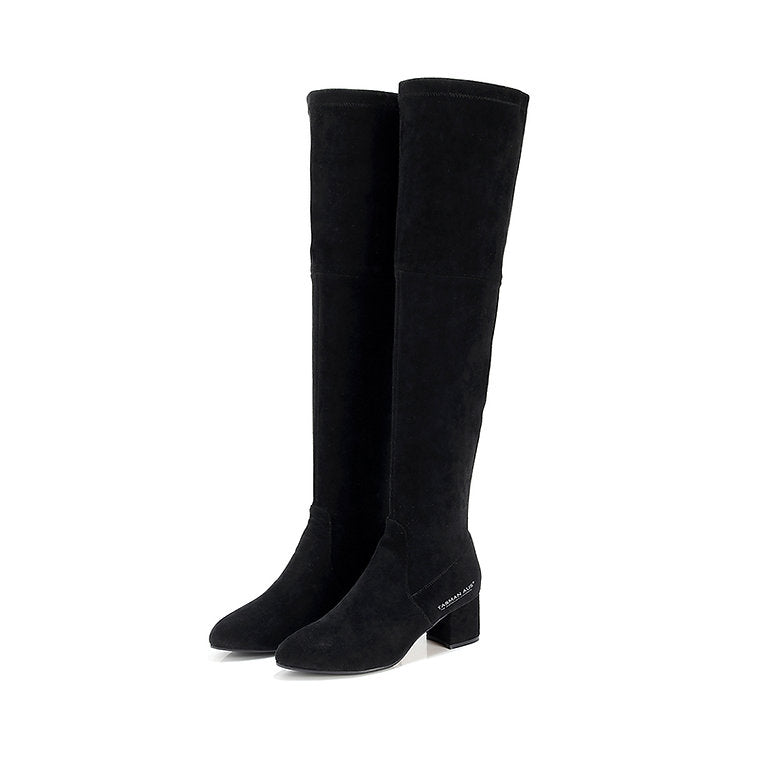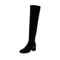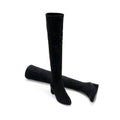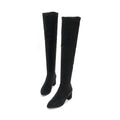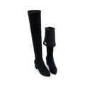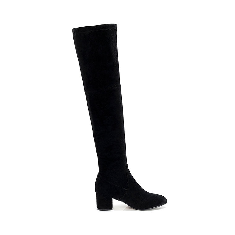 Crafted from stretchy microsuede, they offer a velvety texture and a flattering over-the-knee fit. The almond-shaped toe adds a refined touch, while the extended shaft creates a longer, slimmer silhouette. Perfect for pairing with casual or dressy outfits — these boots bring effortless style to any look.